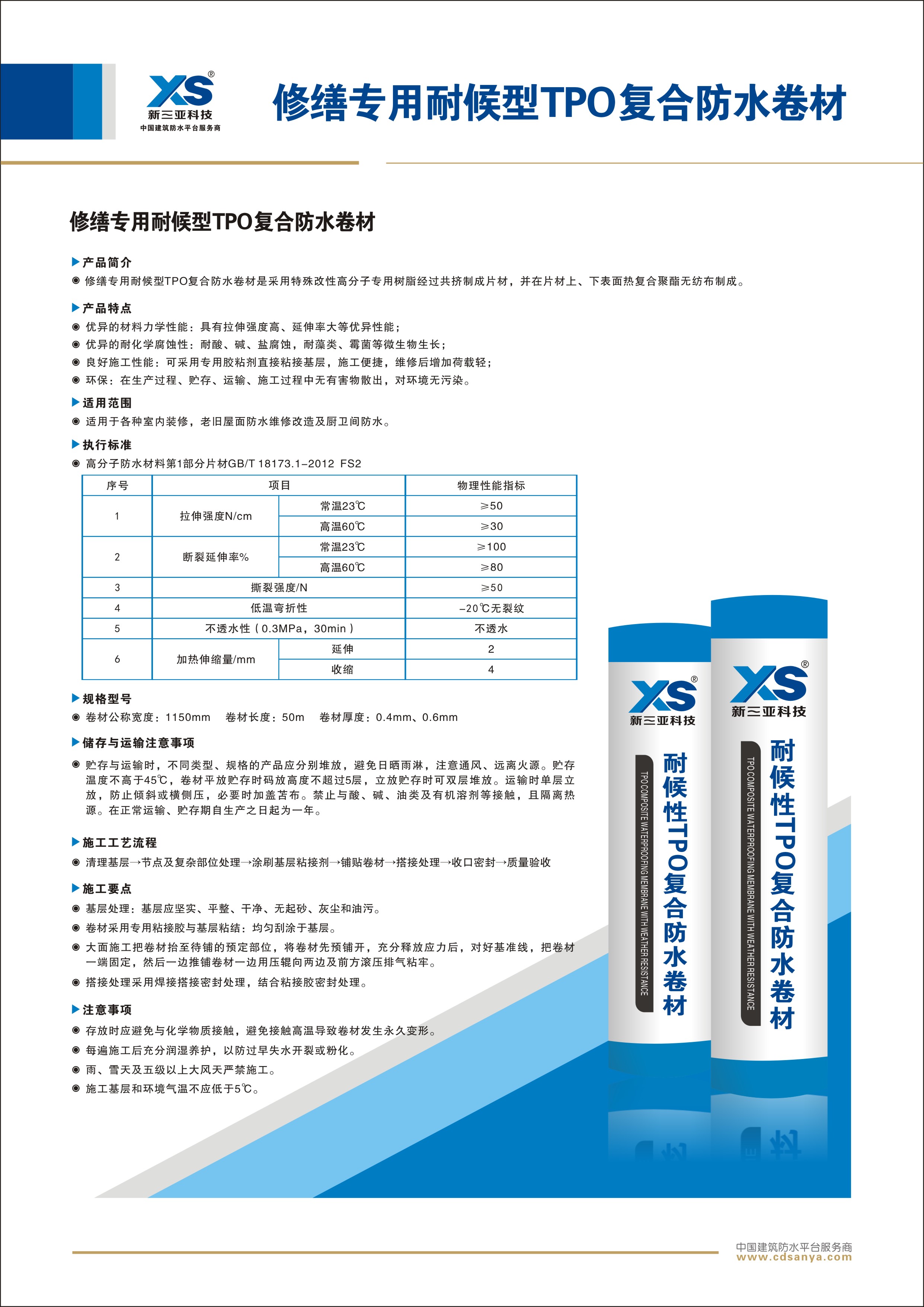 修繕專用耐候型TPO復(fù)合防水卷材是采用特殊改性高分子專用樹脂經(jīng)過共擠制成片材,并在片材上、下表面熱復(fù)合聚酯無紡布制成。